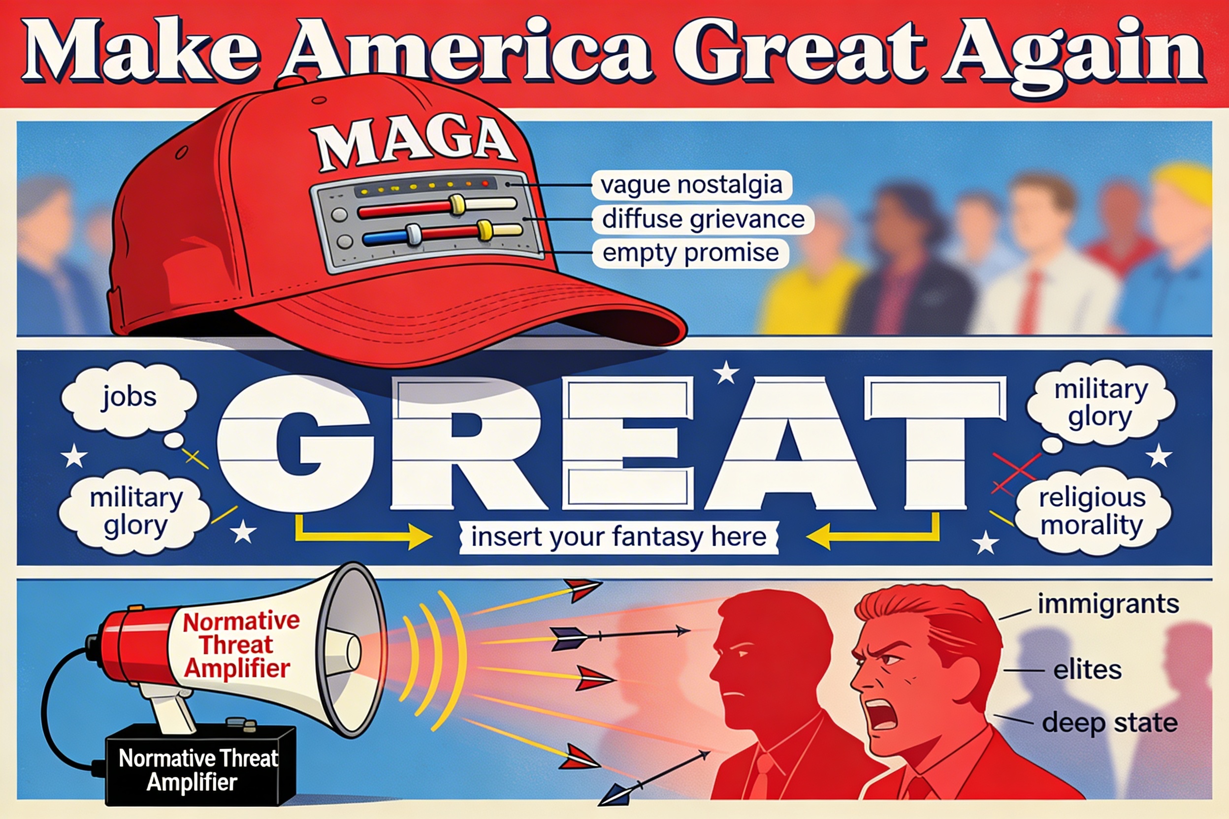 “Make America Great Again” is a masterpiece of cognitive engineering: it combines unspecified nostalgia, diffuse grievance, and an empty promise in four words that any voter can fill with their own fantasy. Had it been submitted for peer review as an empirical hypothesis, it would have been rejected in the first round for the operational indefinability of “great.” But Stenner’s model explains precisely why it works: it is a normative-threat amplifier disguised as a slogan, activating latent authoritarian predispositions by simultaneously evoking decline (the nation has lost its greatness) and identifying enemies responsible for the loss (immigrants, elites, the “deep state”).