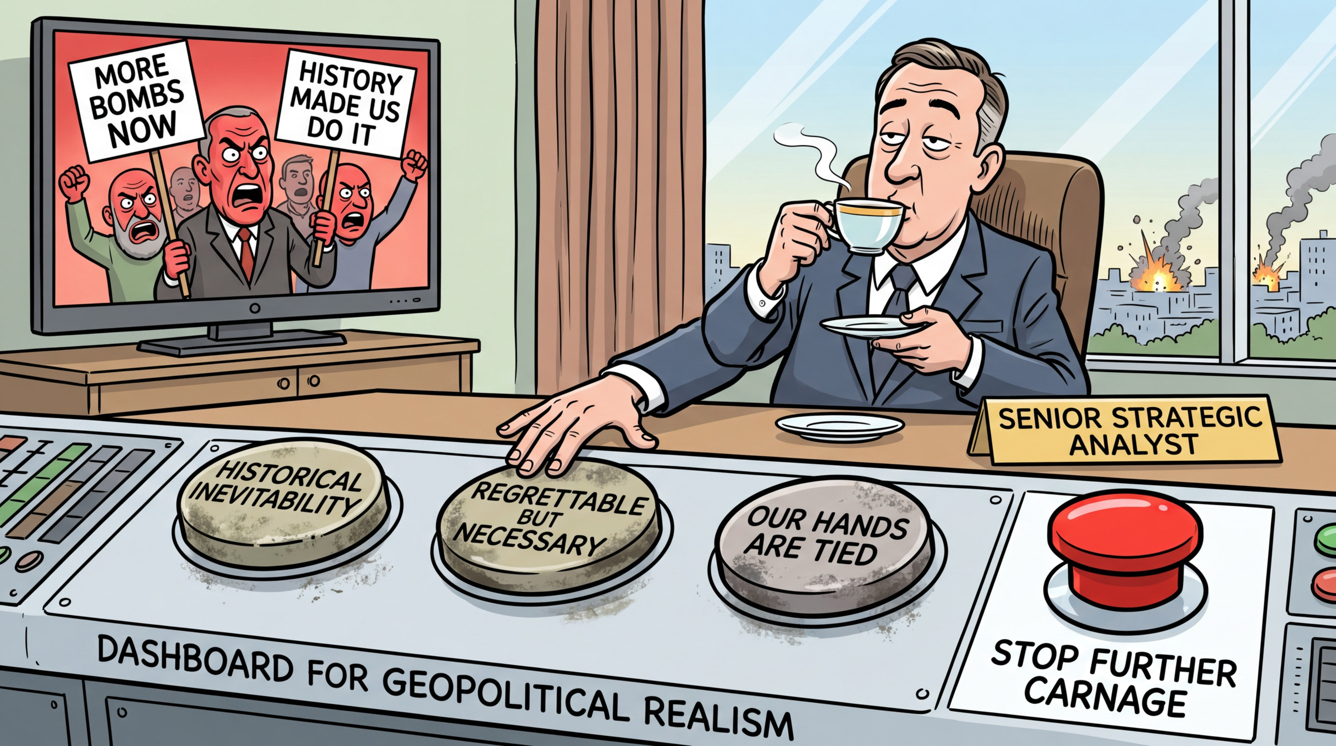 If you have arrived here expecting a balanced text presenting “both sides” of the debate on whether it is acceptable to bomb hospitals or threaten allies with tariffs, I regret to inform you that moral symmetry is not a service this guide provides. What it does provide is documentation — and, in measured concession to the prevailing pedagogical orthodoxy that moral comprehension now requires multisensory stimulation, a selection of satirical vignettes and visual allegories for those who find atrocity more legible in pictures than in footnotes.