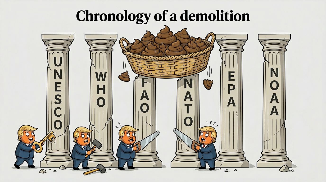 There is a particular species of institutional vandalism that deserves separate attention, because it reveals the self-defeating logic of the current demolition with crystalline clarity: the withdrawal from organisations that the United States itself created, funded, and used as instruments of its own global influence.